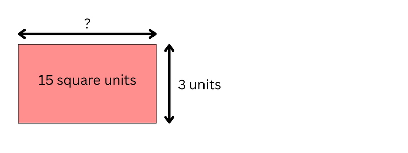 The width of the rectangle is 3 units. The area is 15 square units.