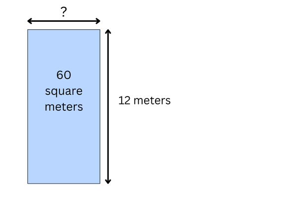 The width of the rectangle is 12 meters. The area is 60 square meters.